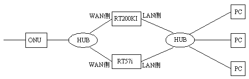 この場合はONU(ひかり終末端子)—(WAN端子)RT200KI(LAN端子)—(WAN端子)RT57i(LAN端子)—PCのように接続します。NTTはブリッジ接続を推奨しています。