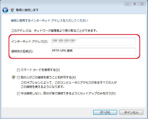 4.インターネットアドレスにPPTPサーバーのグローバルアドレスを入力
