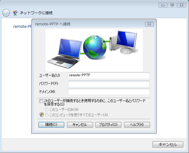 上の仮想プライベートネットワーク接続をクリックして表示されるダイアログでユーザー名とパスワードを入力して[接続]をクリック。ここで入力するユーザー名とパスワードはPPTPサーバーの設定とそろえなければ接続できない。