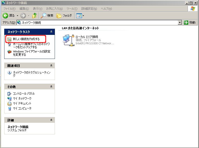 左側のメニューからネットワークタスク>新しい接続を作成するをクリック。