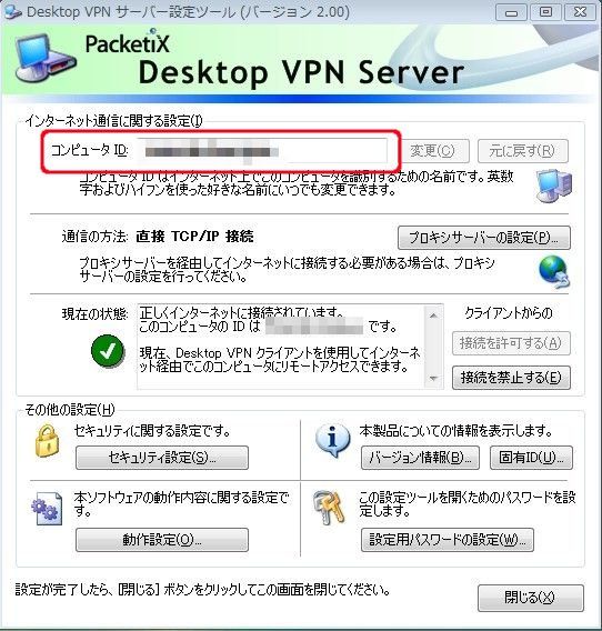 初期のコンピュータ ID は、現在コンピュータが接続している IP アドレスをもとに、適当で他のコンピュータと重複しない文字列が自動的に生成されますが、 後から別のものに変更することも可能。仮にコンピュータ IDが第三者に知られたとしても、セキュリティ上の危険が発生するわけではない。