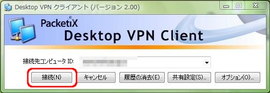 仮に自宅から会社のコンピュータにリモートアクセスしたい場合は、まず、会社のコンピュータに Desktop VPN サーバーをインストールしてコンピュータ ID を指定する。そのIDをクライアントに指定する。 [接続先コンピュータ ID] の欄に「コンピュータ ID」を正確に入力し、[接続] をクリック。