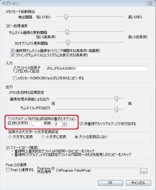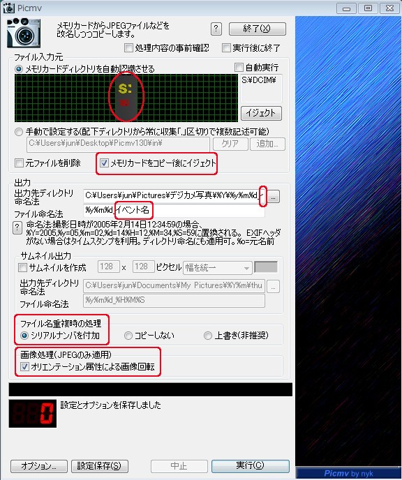 - 取り込みをするドライブ名の指定。複数のUSB接続があると、ドライブ名が変わってしまう可能性があるので、SDカードのドライブをSで固定しました。