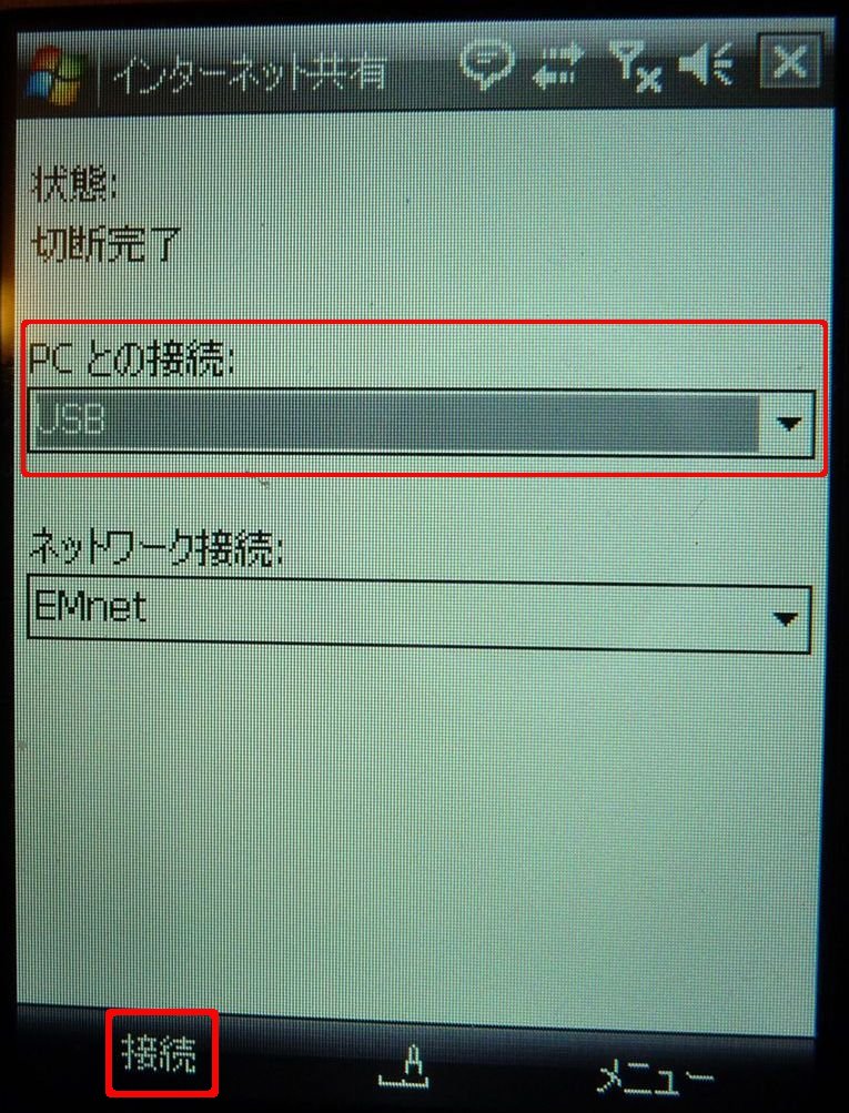 2.PCとの接続でUSB接続を選択 ネットワーク接続はEMnetを選択>接続をクリック
