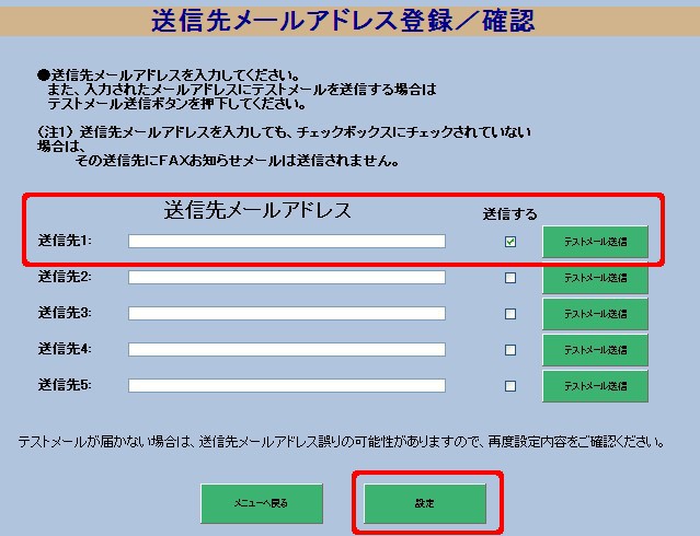 FAXが送られてきたとき知らせるためのmailアドレスを指定する。最大5個設定可能。