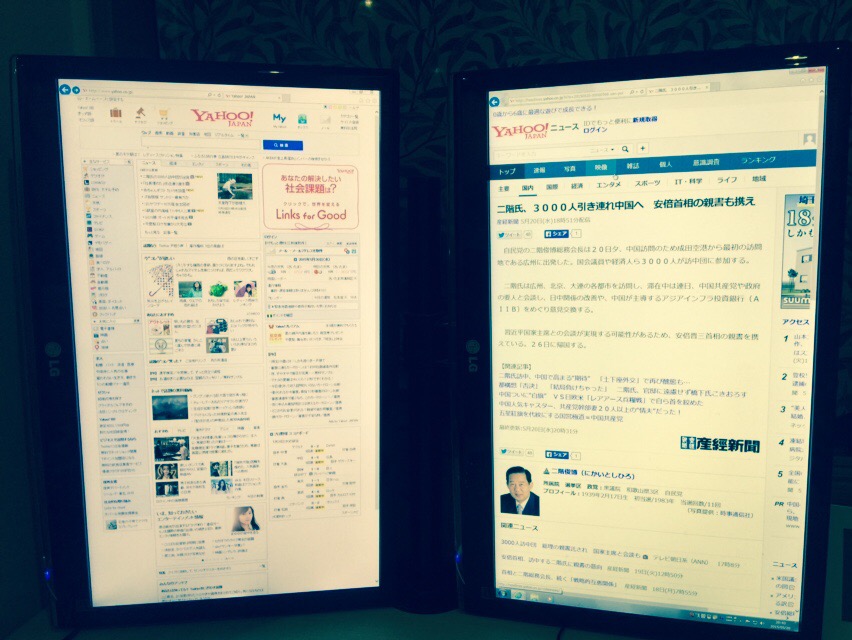 - 1台のモニターは他のネットの記事を見ながら、もう1台はブログサイトにログインして記事を書く