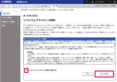 ソフトウェアライセンス契約に同意するに☑をいれて、[設定の確定]をクリック