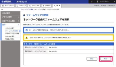 ファームウェアリビジョンの確認が行われ、更新する場合は[実行]をクリック