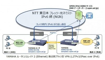 今回は2拠点でYAMAHAルーター「RTX1200」を使ってIPv6折り返し通信を「OPEN IPv6 DDNSサービス」を使ってL2TPv3設定しましょう。