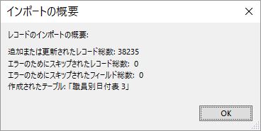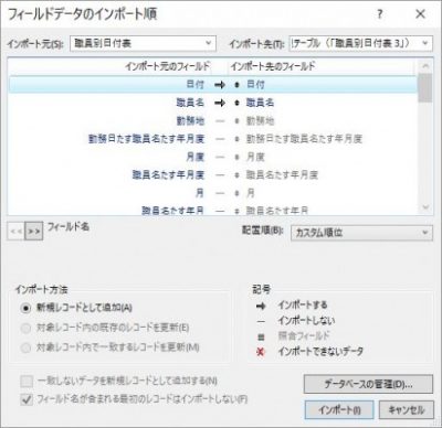 インポート先を先ほど新規インポートした「新規テーブル(職員別日付表)」を選択