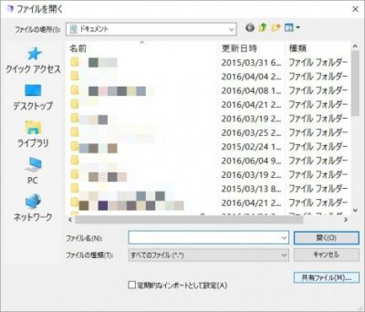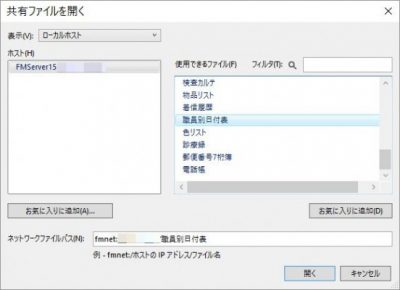 - ファイルメーカーサーバーのファイルを開くときは、[共有ファイル]をクリック
