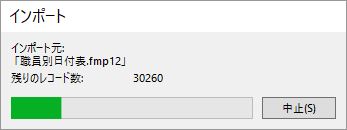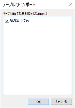 「勤務表」のデータベースの管理を見ると、すでにインポートされた「勤務地別日付表」と今回インポートした「職員別日付表2」のテーブルが作成されたのが確認できます。ともにフィールド名のみインポートされ、0レコードになっているのでまだデータはインポートされていません。今回はすでに職員別日付表がどこかに存在するため自動的に職員別日付表2と連番されたようです。[OK]をクリックして終了。