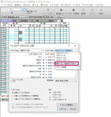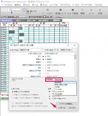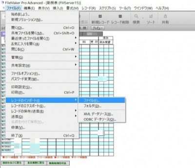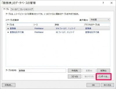 「勤務表」のデータベースの管理からテーブルタグを開き[インポート]をクリック。FilemakerPro Advancedでないとインポート表示が出ません。