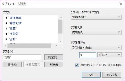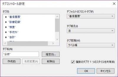 - 一番使うタブコントロールを右上のデフォルトのフロントタブで指定、今回は”診療記録”を指定