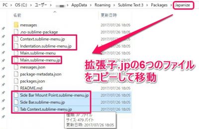 Cドイライブ>ユーザー>ユーザー名>AppData>Roaming>Sublime Text 3>Packages>Japanizeフォルダの中に「拡張子.jp」の6つのファイルを確認してください。