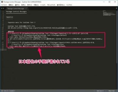 日本語化のパッケージがインストールされました。次の作業は日本語メニューファイルの移動です。どこにどのファイルを移動するかのテキストファイルが表示されます。