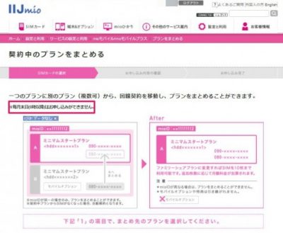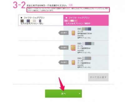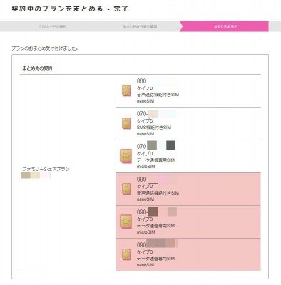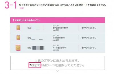 まとめ先のプランを確認。すでに3枚のSIMが契約されているので、あと7枚まで選択可能。