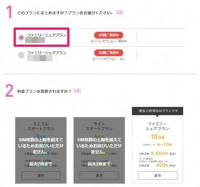 以上で2つのファミリーシェアプランを一つのファミリーシェアプランにまとまりました。6つのSIMカードを10GB+大容量オプション20GB=30GBで運用することになります。万が一データ容量が不足しそうな場合は+5000円で+30GBの大容量オプションにすることも可能です。