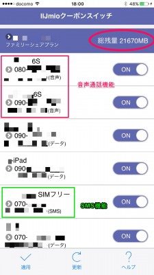 IIJmioのスマホアプリでも以下のように6つのSIMの使用状況が確認できます。