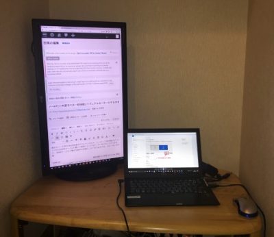 最近のノートPCにはHDMI端子がついているので、モニターにHDMI端子がついていればHDMIケーブルで繋いで簡単にデュアルモニター化することができます。HDMIケーブルで繋げば音声も外部モニターから出力され、スピーカーも不要。