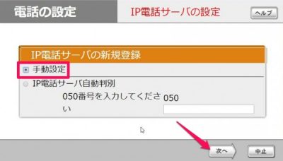 手動設定に☑を入れて、[次へ]をクリック
