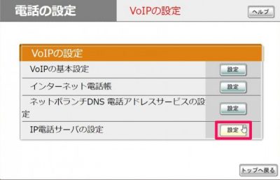 電話の設定>IP電話サーバの設定の[設定]をクリック