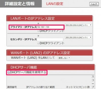 - DHCPサーバー機能はPR400NEとかぶってしまうので使用しないように☑をはずす