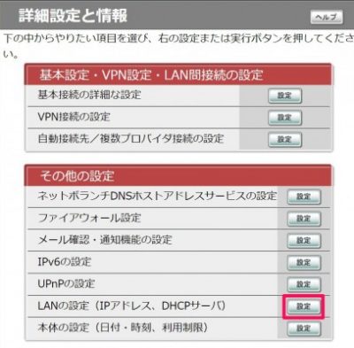 LANの設定(IPアドレス、DHCPサーバー)の[設定]をクリック