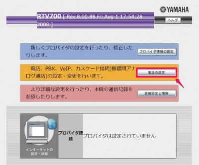 設定したRTV700の192.168.1.100にログインすると設定画面が出てきます。このときはパスワードが設定されていないのでダイレクトに画面が表示されます。[電話の設定]をクリック。