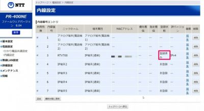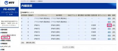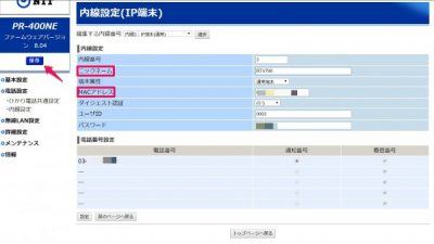 もう一回PR400NEにログイン。電話設定>内線設定を開く。