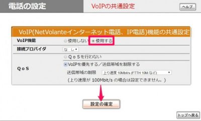 VoIP機能で☑使用するにチェックをいれて、[設定の確定]をクリック