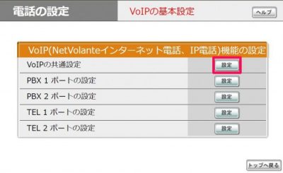 電話の設定>VoIPの基本設定>VoIPの基本設定>VoPIの共通設定の[設定]をクリック
