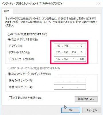 - デフォルトゲートウェイ▶192.168.1.100