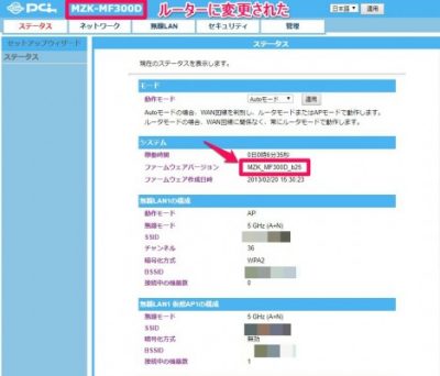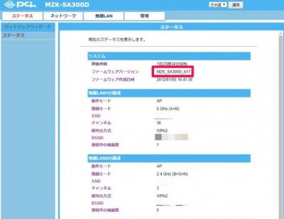 ファームウェアバージョンはMZK-SA300D(アクセスポイント)と確認できる