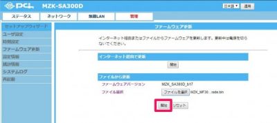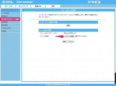 左メニューのファームウェア更新をクリック>ファイルから更新の中の[ファイルを選択]をクリック