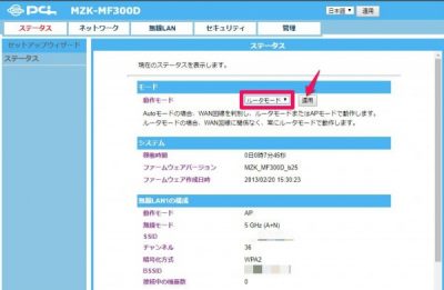 モードをルータモードに変更して[適用]をクリック