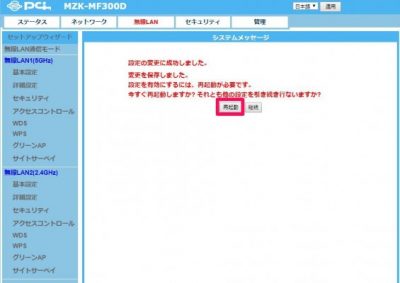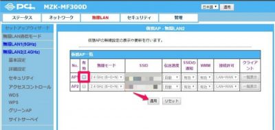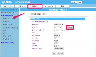 MZKシリーズの無線LANは仮想APがデフォルトでONになっています。使わない場合は必ずOFFにしておきましょう。デフォルトではパスワードなしで通信できるようになっているのでセキュリティ上好ましくありません。5GHzと2.4GHz両方に仮想APが設定されています。