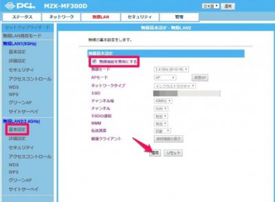 無線LAN>無線LAN(2.4GHz)>[無線機能を無効にする]に☑をいれて[適用]をクリック