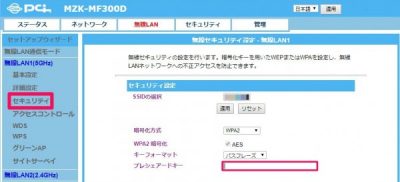 無線LAN>無線LAN(5GHz)>セキュリテイ>プレシェアードキーを入力して[適用]をクリック