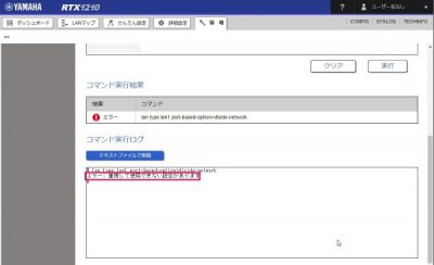 と入力してLAN1ポートを分離設定しようとしたが、失敗。エラー:重複して使用できない設定がありますとログ表示