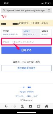 携帯電話に6桁の数字がメッセージで送信され、確認コードを入力して[設定する]をクリック