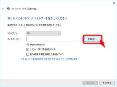 ドライブ名を選択>今回はW:を指定