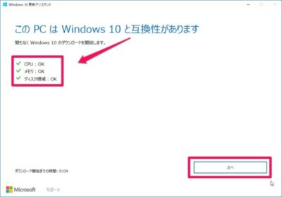 互換性のチェックが行われ、問題なければ[次へ]をクリック