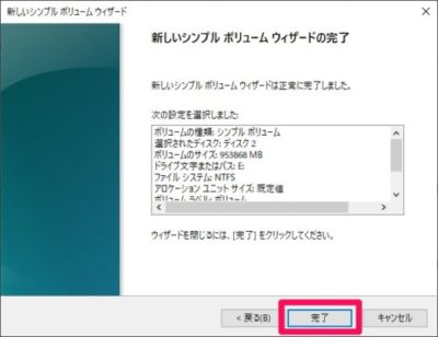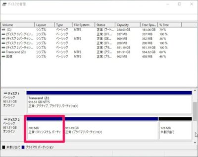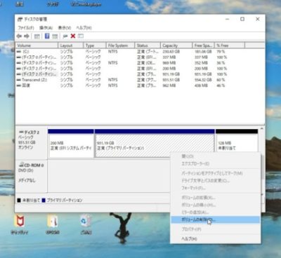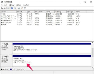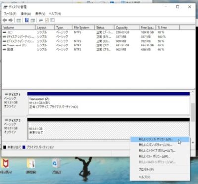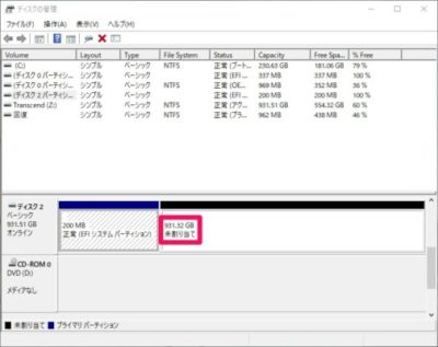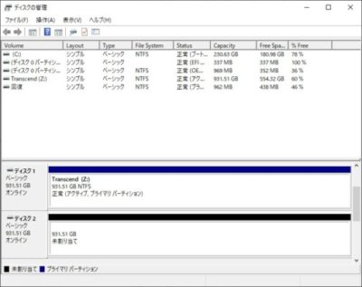もう一度ディスクの管理を見るとディスク2が931.51GBすべてが未割り当てとなって、完全削除されています