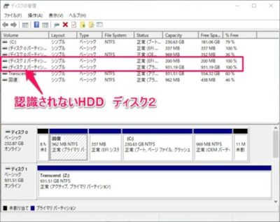 エクスプローラーのPCで表示されなかったHDDディスク2が出てきました