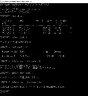 ディスク0~2が表示されいるが対象ディスクは2なので - DISKPART>select disk 2を入力してenter